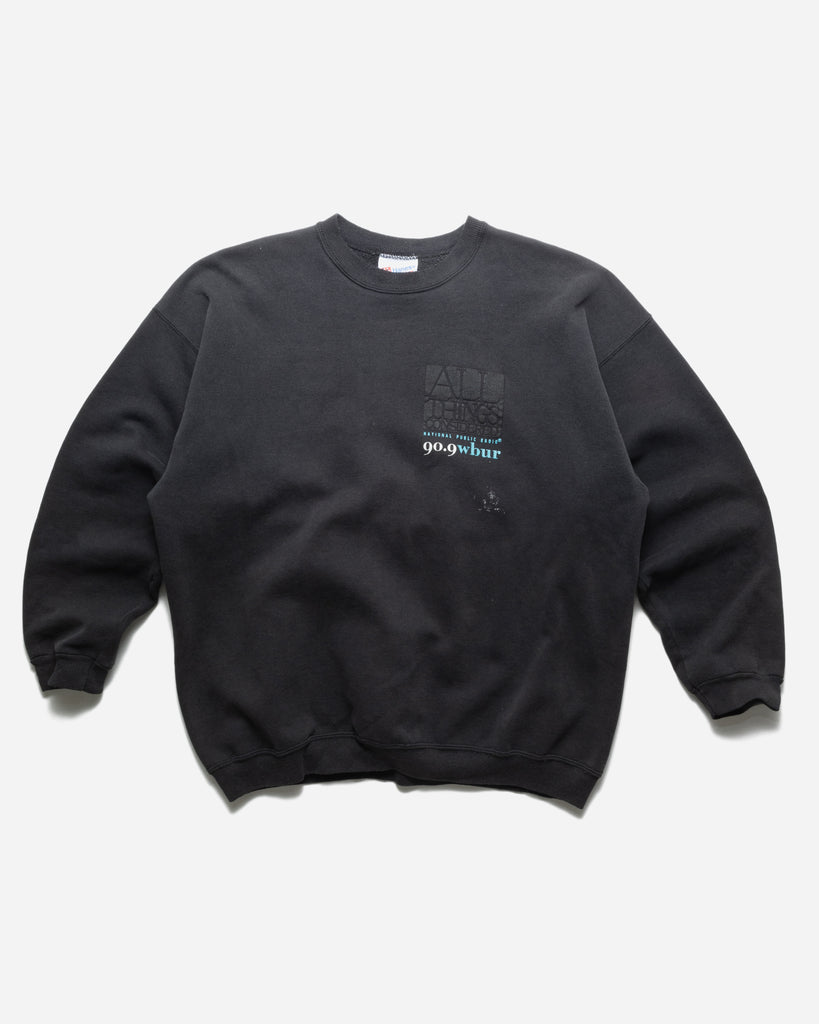 VINTAGE 1990S 'ALL THINGS CONSIDERED' FADED BLACK CREWNECK SWEATSHIRT