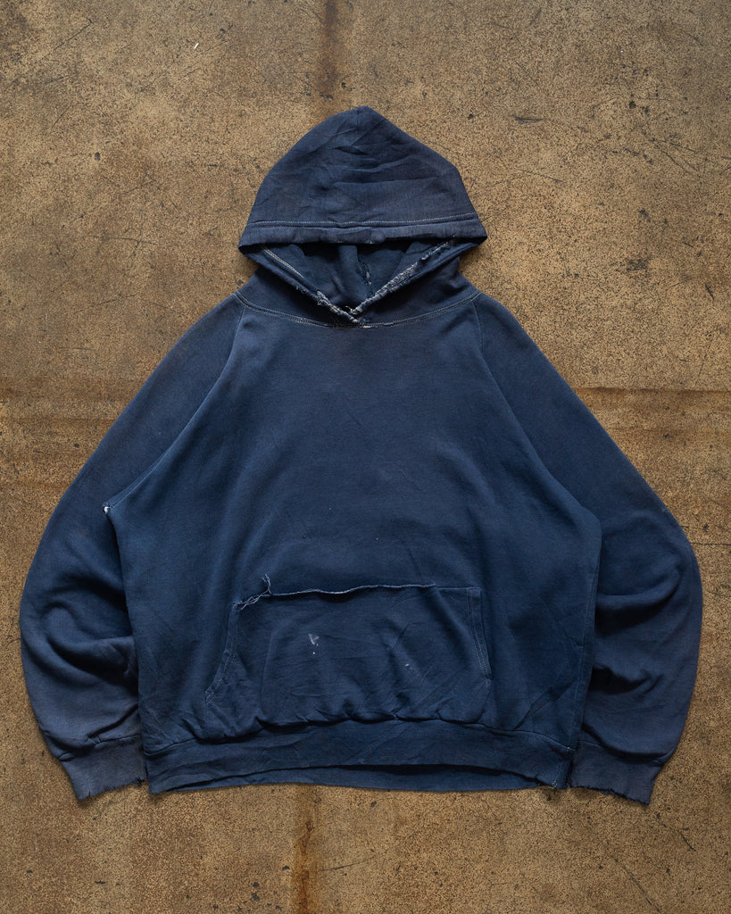 Blue Blank Thermal-Lined Distressed Raglan Hooded Sweatshirt - 1980s