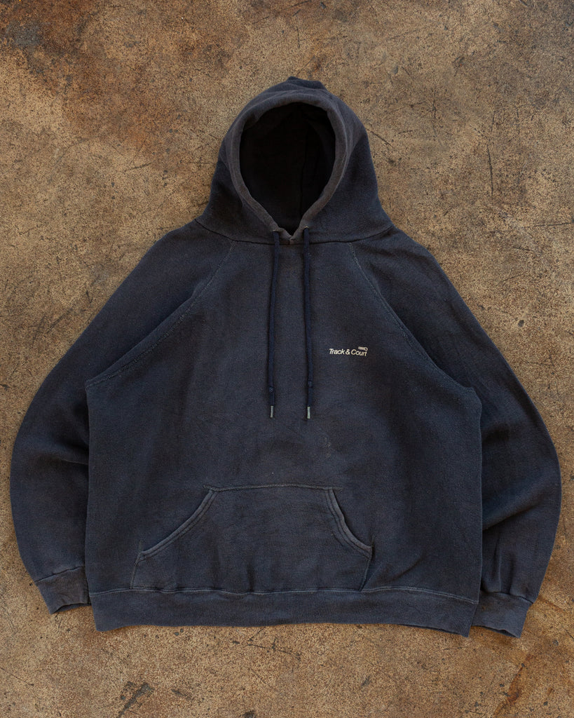 "Track & Court" Faded Navy Hooded Raglan Sweatshirt - 1980s