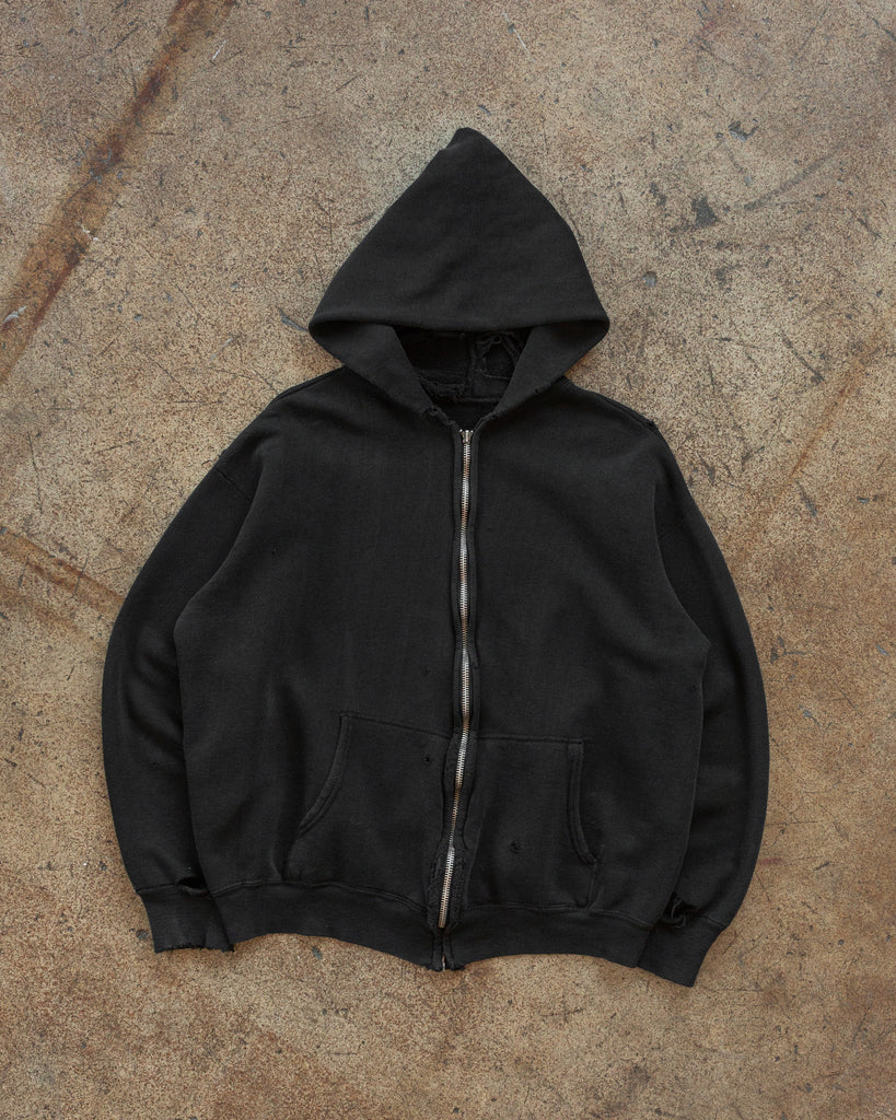 Black Distressed Zip-Up Hooded Sweatshirt - 1980s