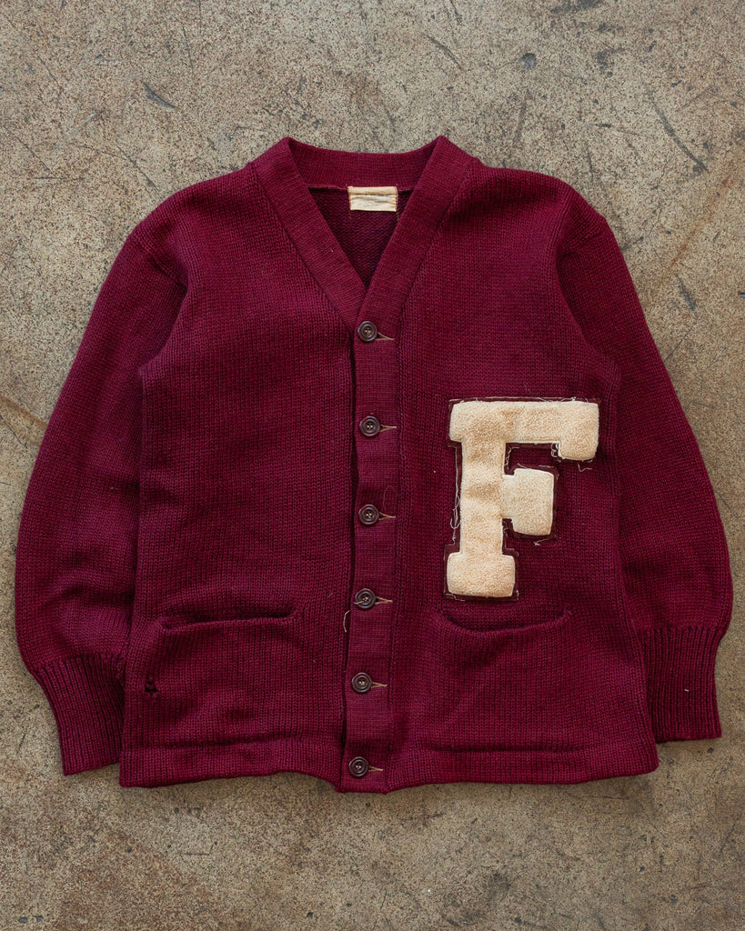 Burgundy Letterman Cardigan Knitted Sweater - 1950s
