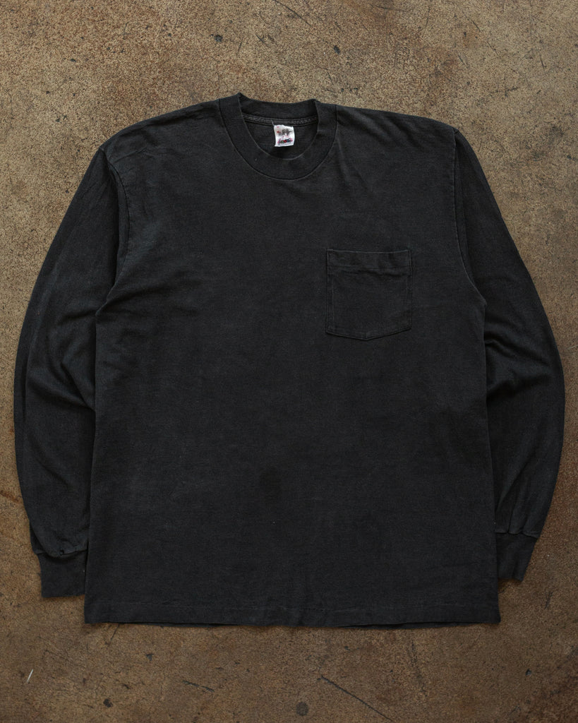 Single Stitched Faded Black Blank Long-Sleeve Pocket Tee - 1990s