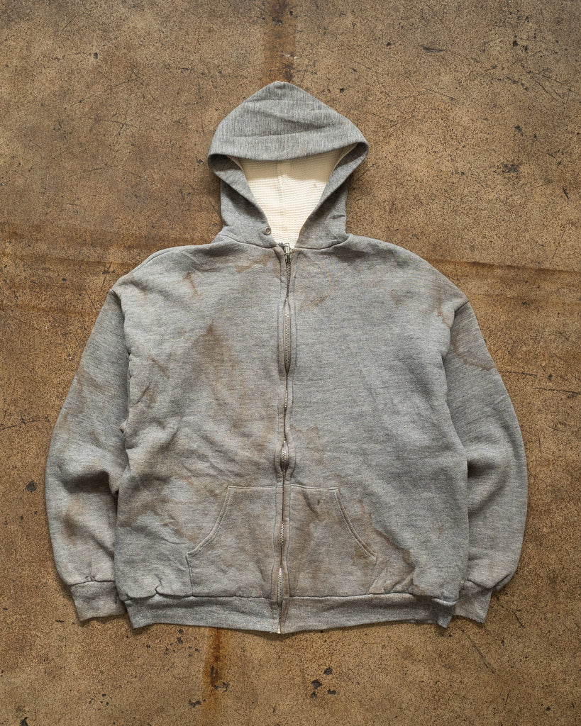 Grey Thermal-Lined Zip-Up Distressed Hooded Crewneck Sweatshirt - 1990s