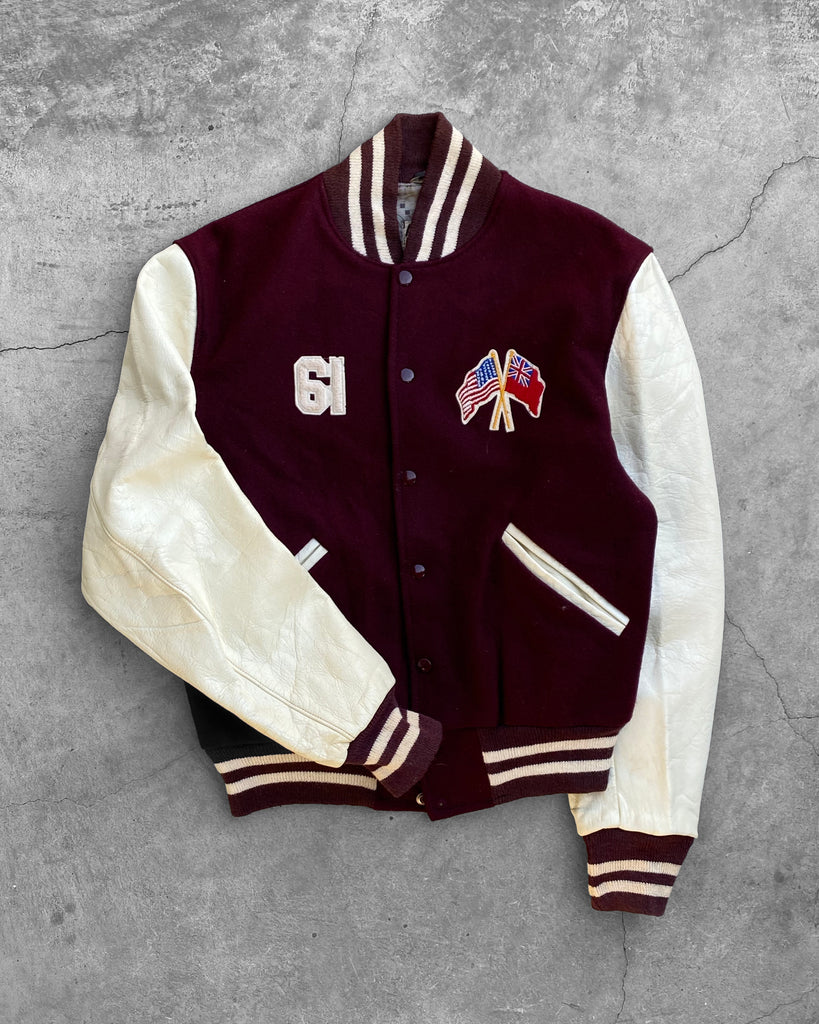 Burgundy "R" Leather Sleeve Varsity Jacket - 1960s