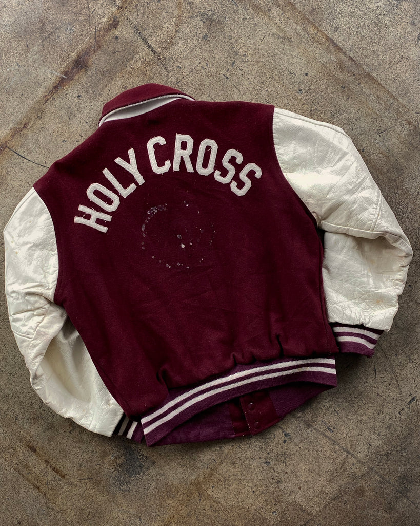 Burgundy "Holy Cross" Leather Sleeve Wool Varsity Jacket - 1980s