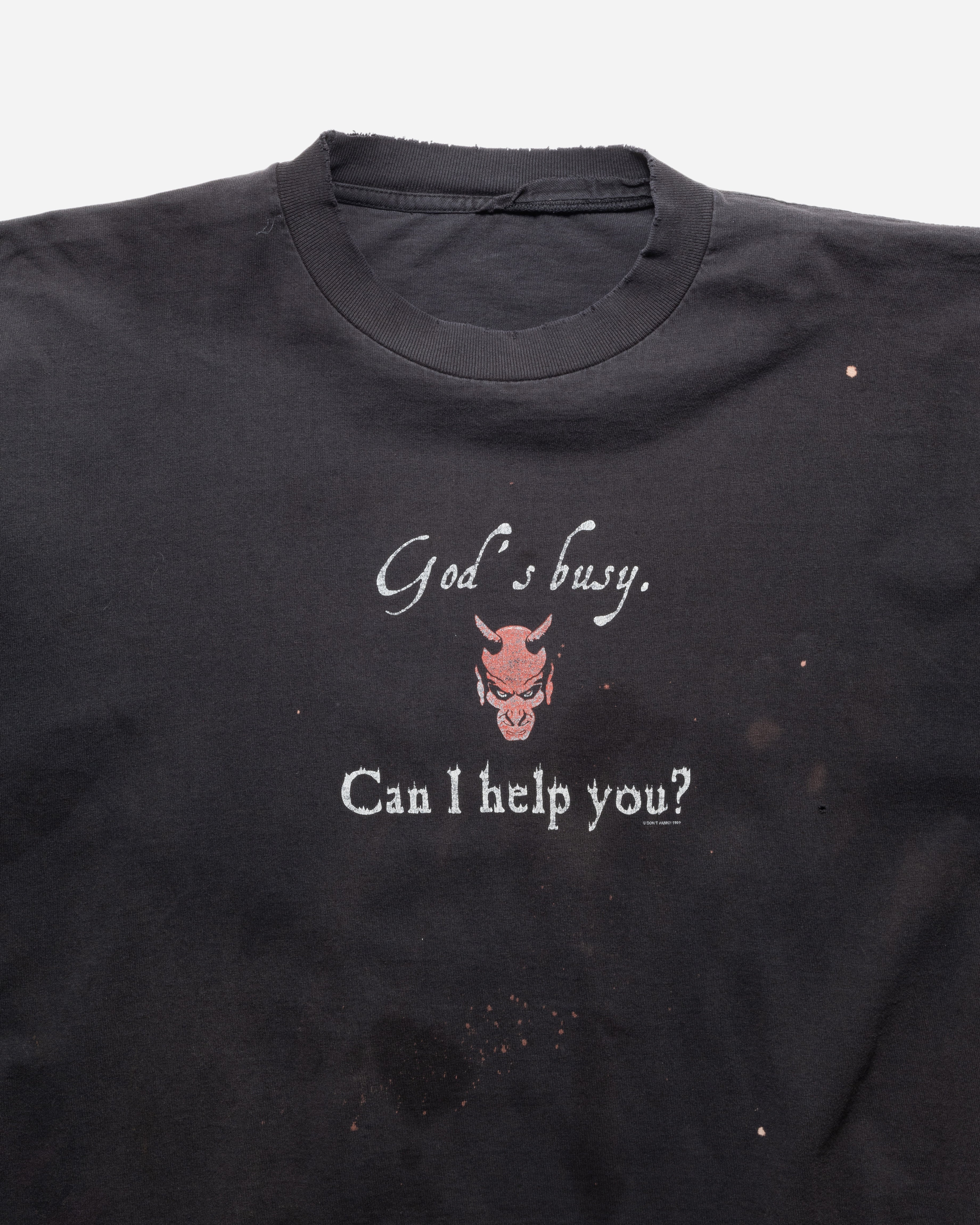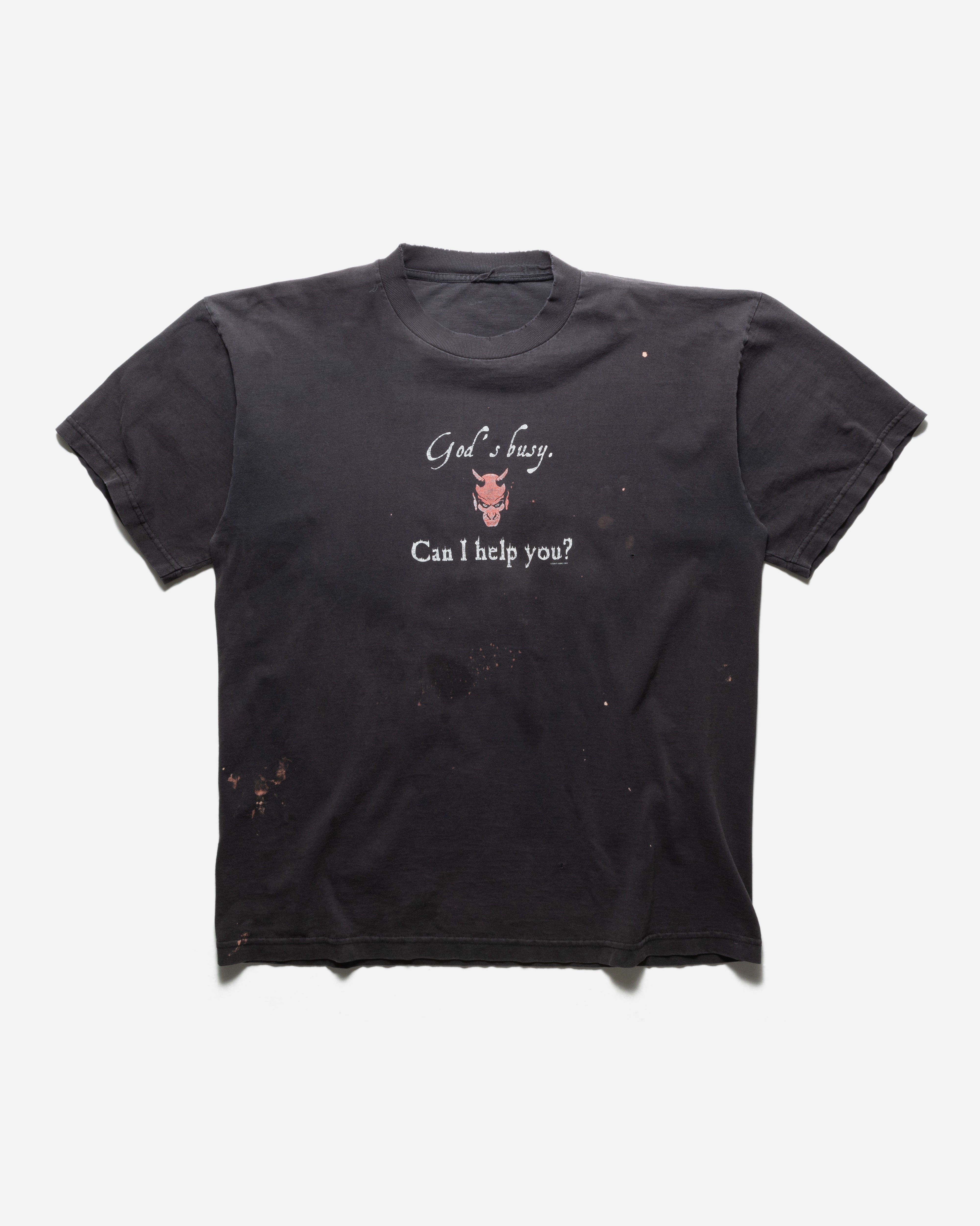 VINTAGE 1990S/2000S 'GOD'S BUSY CAN I HELP YOU?' FADED BLACK T-SHIRT