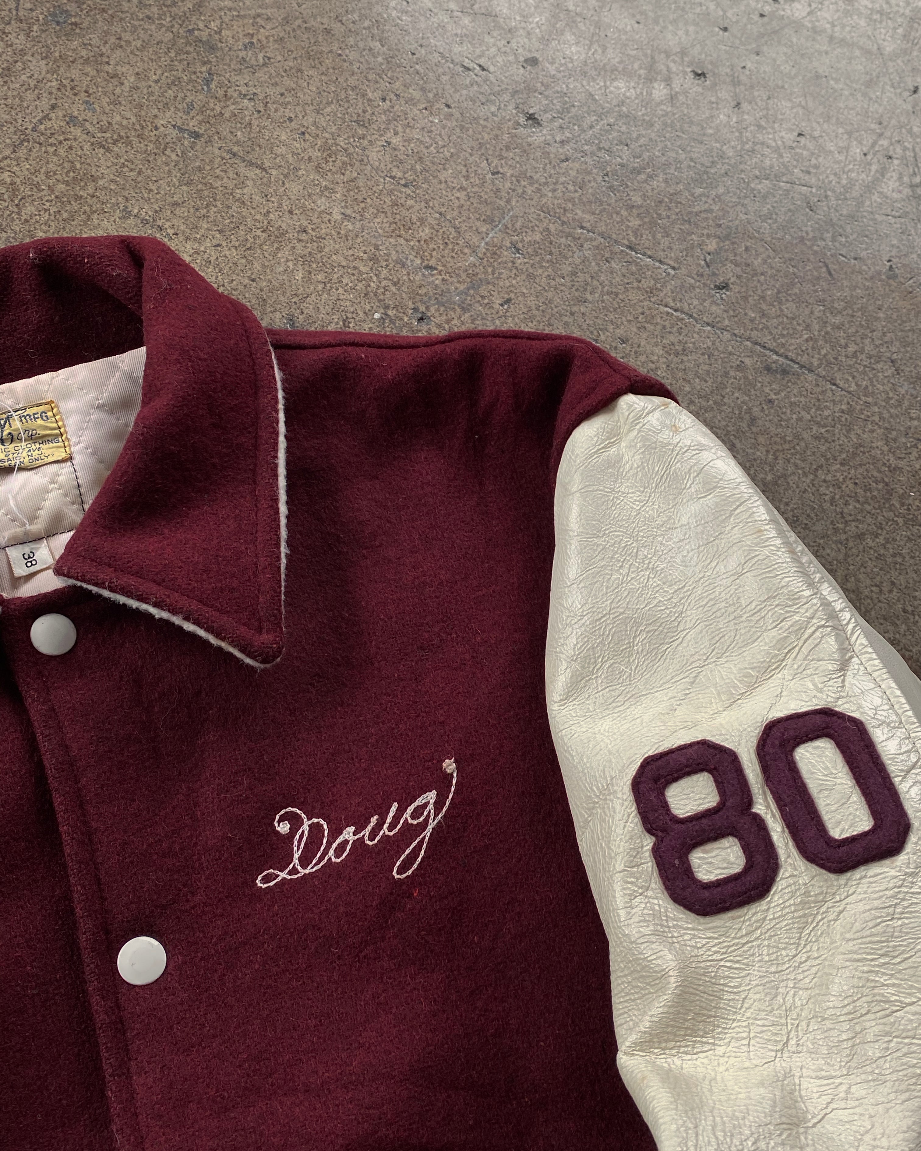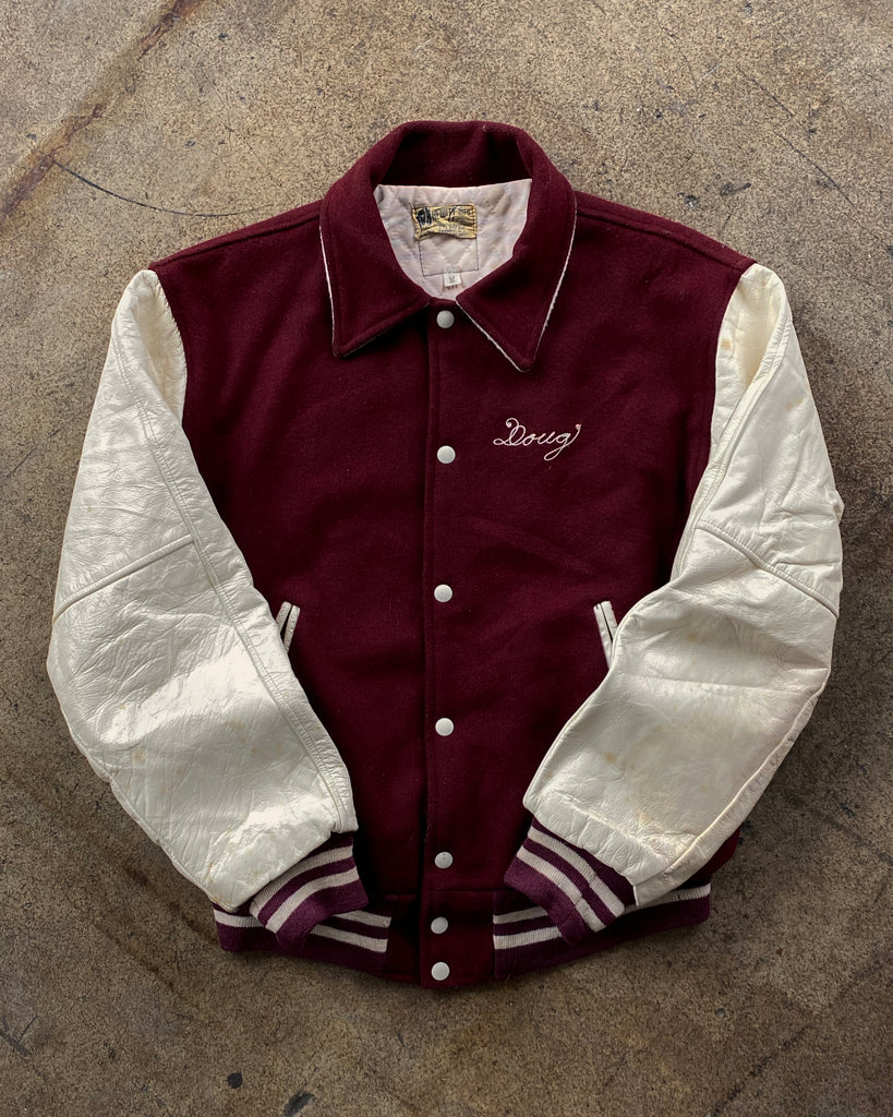 Burgundy "Holy Cross" Leather Sleeve Wool Varsity Jacket - 1980s