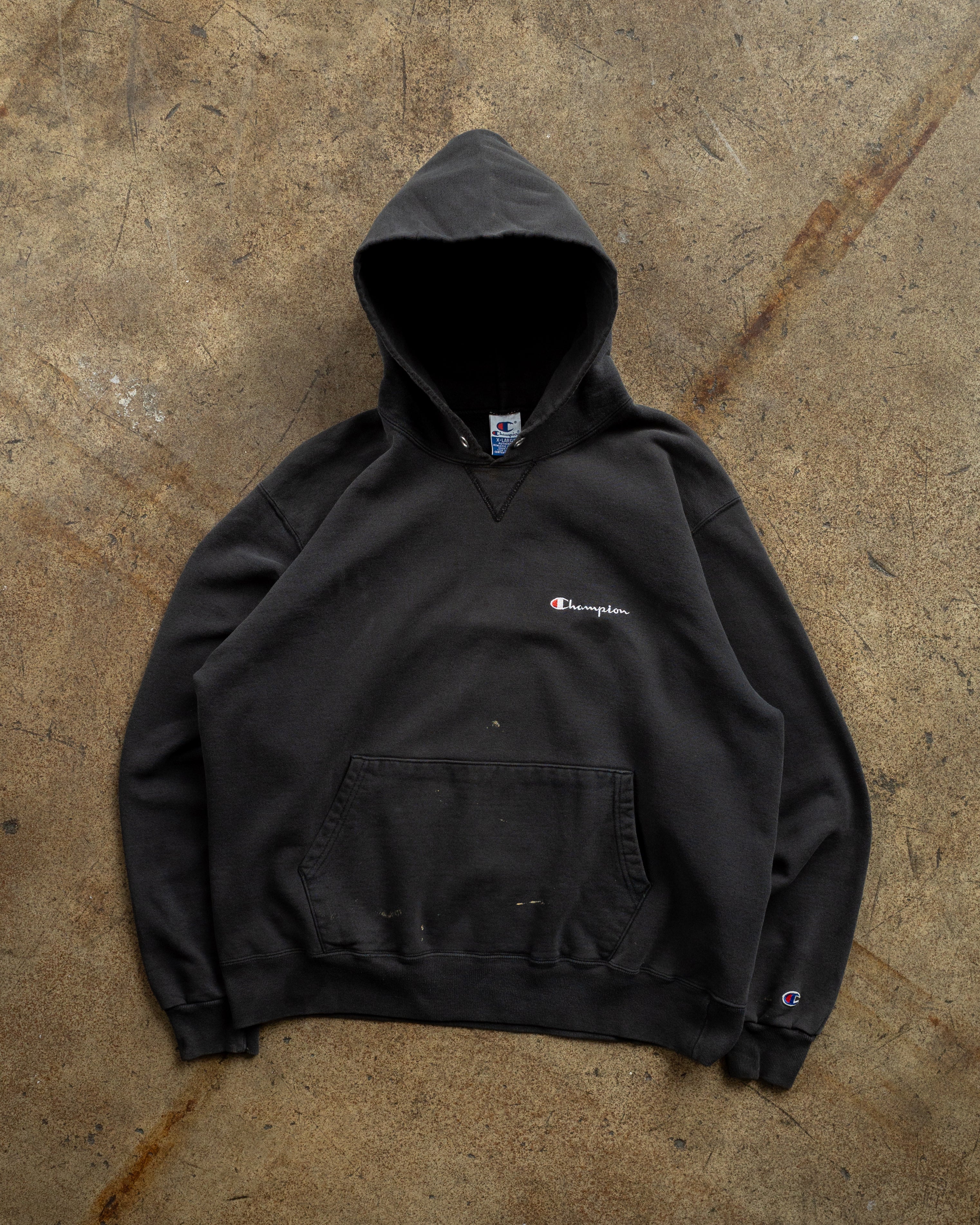Champion Faded Black Painted Script Logo Hooded Sweatshirt - 1990s